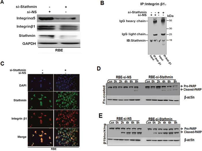 Figure 6: The suppression of functional integrin β1 and knockdown Stathmin could intensify apoptosis. A. The expression of integrin α5 and β1 were inhibited in response to the RBE cells transfected with Stathmin-siRNA detected by Western blot analysis. B. Total RBE cells were transfected with Stathmin-siRNA or non-sense cell extracts immunoprecipitated with integrin β1 antibodies and then immunoblotted with Stathmin antibodies. C. Stathmin and integrin β1 converged on cytoplasm and cell membrane in RBE-si NS cells. D. The acquired lysates from cells grown on FN-coated plates under 2.5 μM STS condition; extracts from cells plated in no FN-coated surfaces performed as control samples (con). The total protein lysates probed with PARP and β-actin antibodies. E. Aliquots of cells suspension pre-incubated with the β peptide or control (nonsense peptide) 100μM as and incubated for 12 hrs before STS treatment at diverse time points; Western blot was performed with PARP and β-actin antibodies.