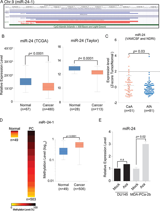 Figure 1: Chromosome location of miR-24-1 and expression levels in PCa tissues. (A) Schematic diagram of miR-24-1 on chromosome 9 from UCSC genome browser. (B) Box plot of miR-24 expression using TCGA (Normal, n = 67; PCa, n = 480) and GEO (Normal, n = 28; PCa, n = 113) databases. (C) Quantitative PCR expression analysis with AfA and CaA prostate cancer tissues from VAMCSF and NDRI patient cohorts (CaA, n = 51; AfA, n = 81). Cut off; Z = 2, Fisher’s exact test, p = 0.03181, OR = 8.562693, 95% CI [0.9850, 76.77]. (D) Heatmap and box plot showing methylation level of TCGA 450K array data (Normal, n = 49; PCa, n = 506). P-value was calculated by Mann-Whitney U test. Bar = ± SD. (E) miR-24 expression level in 5Aza-CdR treated and untreated PCa cell lines. P-value was calculated by two-tailed t-test. Bar = ± SEM.
