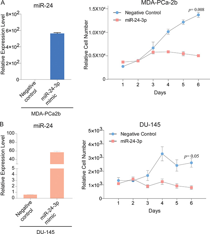 Figure 2: miR-24 over-expression decreases PCa cell proliferation. (A, B) Left bar graphs, Relative expression level of miR-24 after transfection with miR-24 mimic and negative control; Right line plots, Proliferation assay of MDA-PCa2b, DU-145 and cells that were transfected with miR-24 mimic or negative control for 6 days. Bar = ± SEM.