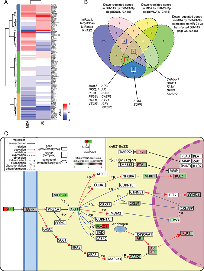Figure 4: Gene expression profile analyses evaluating the effect of miR-24 on prostate cancer cell lines by qPCR based array analysis. (A) Hierarchical clustering and heatmap analyses of gene expression profiles in DU-145 and MDA-PCa-2b. The expression values were calculated by dividing values of miR-24 transfectant with that of negative control. (B) Venn diagram of miR-24 predicted targets and down-regulated genes after miR-24 transfection in MDA-PCa-2b and DU-145. Blue, circle indicates the group of genes which are predicted by at least one database out of miRWalk, TargetScan, miRanda and RNA22. The pink circle show down-regulated genes (≤ 0.75 FC) in DU-145 cells. Yellow circle shows down-regulated genes (≤ 0.75 FC) in MDA-PCa-2b cells. Green shows genes that are down-regulated only in MDA-PCa-2b (≤ 0.75 FC), but did not in DU-145 cell. (C) Pathway map with representative genes altered by miR-24. “Pathview” analysis mapped qPCR array data to “Pathway in Prostate Cancer”, “Transcriptional Misregulation in Cancer” that has been defined by KEGG pathway database and renders pathway graph with the mapped data. The boxes surrounding gene symbols are illustrated by two colors. Left side color of the box shows expression change in DU-145 cells after miR-24 transfection and right side shows that for MDA-PCa-2b cells. The color indicates gene expression level in each cell line.