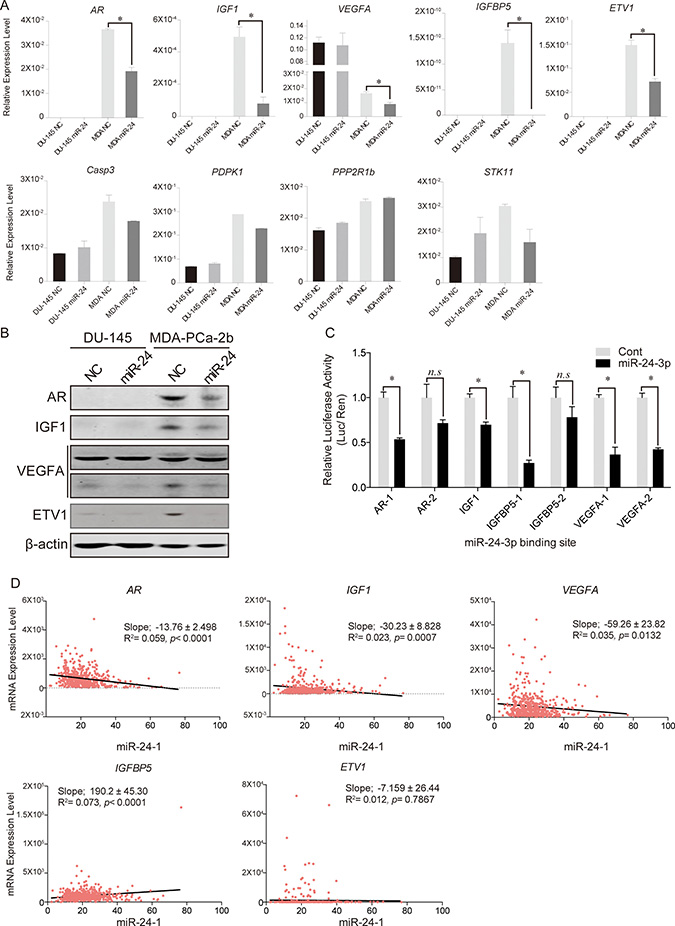 Figure 5: Predicted target gene expression changes after miR-24 induction. (A) qPCR analyses for the predicted target genes of miR-24. We checked candidate gene expression levels after miR-24 over-expression. *p < 0.05, Bar = ± SEM. (B) Western blotting of miR-24 target genes. (C)The results of Dual Luciferase Reporter Assays. Except for IGF1, all genes have two different binding sites (for instance; AR-1 and AR-2 mean that miR-24 was predicted that it may bind to two different site of AR mRNA). *p < 0.05, n.s; no significance, Bar = ± SEM. (D) Linear regression model of mRNA expression levels between miR-24-1 and its five target genes in human PCa samples.