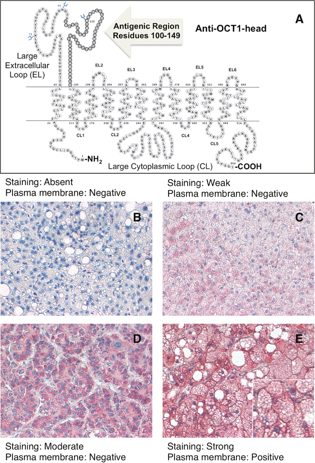 Figure 2: Schematic drawing of OCT1 showing the antigenic region used to raise the rabbit polyclonal LS-C31870 anti-OCT1-head antibody. A. Representative images of immunohistochemical analysis showing the criteria used for hepatocellular carcinoma score depending upon the degree of slides staining with anti-OCT1-head antibody as: absent B. weak C. moderate D. and strong E. and the lack (B, C, D) or the presence E. of staining at the plasma membrane.