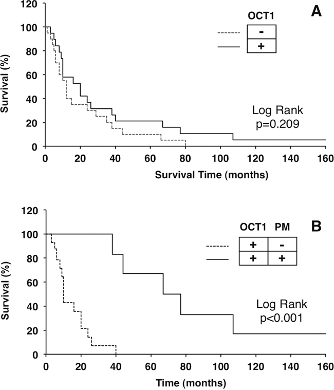 Figure 5: Kaplan-Meier plots of survival after starting hepatocellular treatment with sorafenib. Patients were classified based only on the degree of OCT1 staining. A. or taking also into account the presence of the staining at the plasma membrane. B. Comparisons were performed with the Log Rank (Mantel-Cox) test.