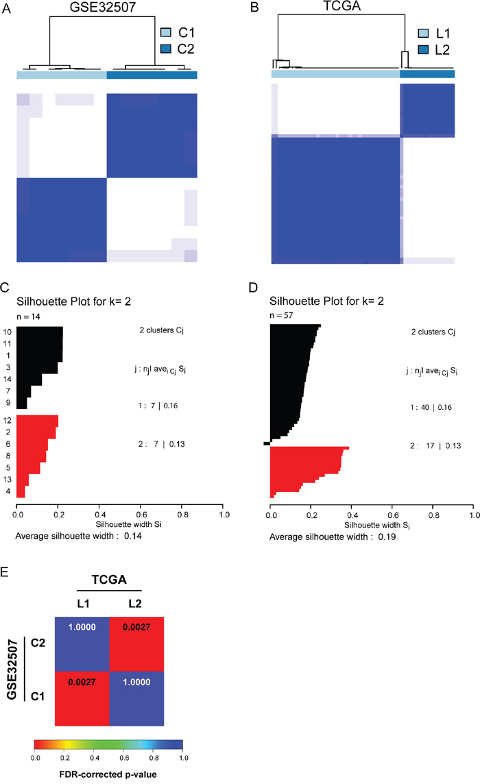 We subsequently performed a SubClass Mapping (SubMap) analysis to determine if the subtypes identified in the two above datasets are correlated. The SubMap result indeed showed that C1 and C2 subtypes in GSE32507 are highly correlated with L1 and L2 subtypes in TCGA dataset, respectively (Figure 1E).
