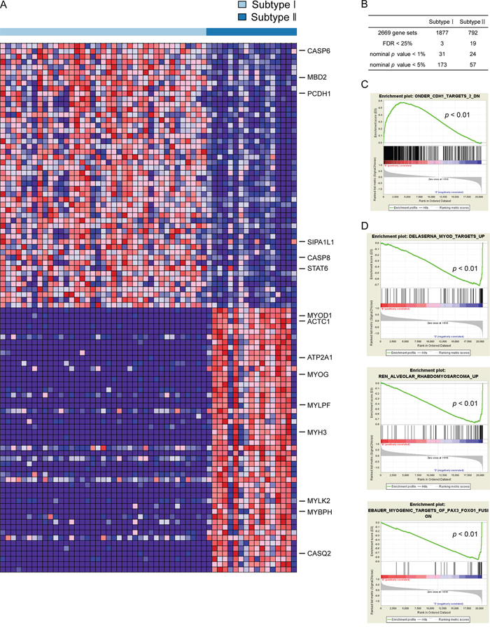 Figure 2: Different gene expression signatures enriched in distinct molecular subtypes. A. Subtype I and subtype II have different gene expression patterns revealed by GSEA. Red, over-expressed genes; Blue, down-expressed genes. B. The summary of GSEA results. C. and D. The gene sets enriched in subtype I and subtype II reveal distinct gene expression signatures. Permutation=1000, p<0.01.