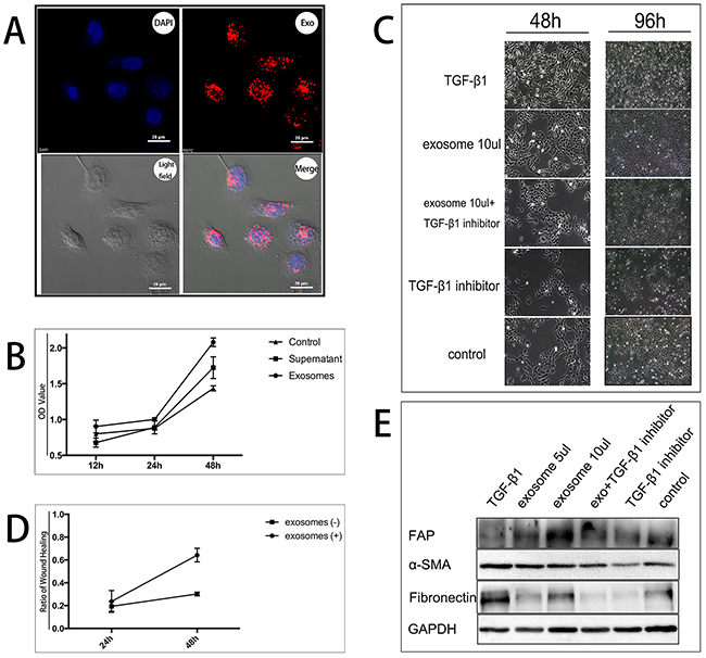 Figure 2: Exosomes promote HMrSV5 cells transition into CAFs by proliferation in vitro. A. The uptake of tumor-derived exosomes by MCs. HMrSV5 cells incubated with PKH26 labeled tumor-derived exosomes for overnight. The upper left panel shows DAPI-dyed HMrSV5 cell nucleus. The upper right panel shows PKH26-dyed exosomes. The lower left panel shows light field image of HMrSV5 cells. The lower right panel shows merge image demonstrating PKH26 labeled exosomes entered HMrSV5 cells. B. Proliferation of HMrSV5 cells after treatment with exosomes. HMrSV5 cells at 5×103 cells/well were treated with exosomes for 12, 24 and 48 h. HMrSV5 cells treated with the same amount of DMEM served as control. CCK-8 assays were performed in triplicate for each value. After 48 h, the number of HMrSV5 cells treated by exosomes (represented by OD value) was significantly higher than those without treatment p < 0.05. C. 5/10 μl exosomes (10 μg/105 PBL) or 1 μl TGF-β1 (5 ng/ml) promoted proliferation of HMrSV5 cells under morphological observation. Adding 0.76 μl TGF-β1 inhibitor (10 μM/L) alleviated the effect of exosomes or TGF-β1. D. Wound healing ratio of HMrSV5 cells after scratch closure assay. After 48 h, wound healing ratio (recovered region/initial scratched region) of HMrSV5 cells treated by exosomes was significantly higher than rate of non-treated cells p < 0.05. E. Western blotting assay of FAP, α-SMA and fibronectin in HMrSV5 cells treated by exosomes or TGF-β1.