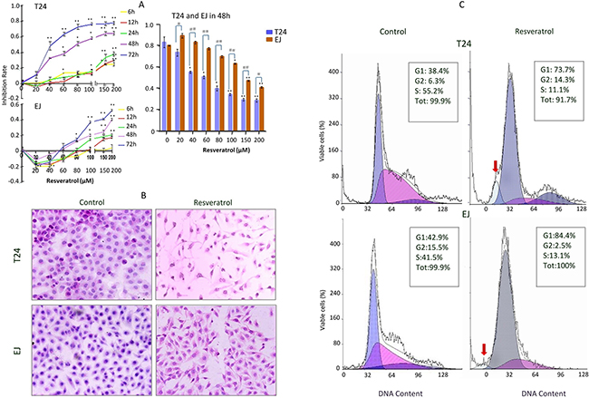 Figure 1: Chemosensitivity evaluation of resveratrol to T24 and EJ cells. A. Effect of resveratrol treatment on human bladder cancer (HBC) T24 and EJ cells. Cells were incubated with different concentrations (0, 20, 40, 60, 80, 100, 150 and 200μM) resveratrol for different time periods (0, 6, 12, 24, 48 and 72h), respectively, and then the cells number was determined by MTT as described in the Materials and Methods. Data are presented as means ± S.D. of three independent experiments. Bars means standard errors, *P<0.05, **P<0.001 reveal significant difference between RV-treatment and Control HBC cells. #P<0.05, ##P<0.001 show significant different between T24 RV-treatment cells and EJ RV-treatment cells. B. HE morphological staining performed on T24 and EJ cells without (Control) and with 100μM RV (Resveratrol) incubation for 48 hours (100×). Cells at a density of 4×105 cells per well were placed in dishes with coverslips, then T24 and EJ cells were treated without (Control) and with (Resveratrol) 100μM resveratrol treatment for 48h. Cells coverslips were harvested for examination and T24 cells exhibited more obviously spindle-shaped change than EJ cells. C. Flow cytometry analysis on the fractionation of cell cycles and apoptotic cells in T24 and EJ cell populations without (Control) and with (Resveratrol) 100μM resveratrol incubation for 48 hours. Red arrows, indicate the peak of apoptotic cells. Data revealed a presentative experiment in triplicate with similar results.
