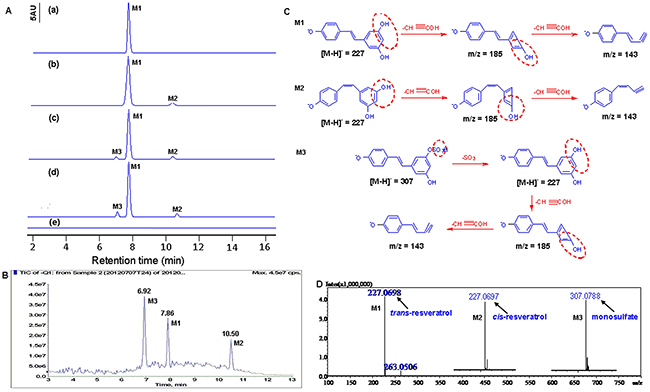 Figure 2: Identification of resveratrol’s metabolites in HBC T24 cells. A. HPLC chromatography analysis. (a) trans-resveratrol standard was dissolved in methanol and analyzed by HPLC (M1, tR=7.86); (b) The culture media incubation with resveratrol without T24 cells for 48h (M1, tR=7.86; M2, tR=7.02); (c) The T24 cells lysate was analyzed after incubation with 100μM resveratrol for 48h (M1, tR=7.89; M2, tR=7.06; M3, tR=10.38); (d) The supernatant of T24 cells was analyzed after incubation with 100μM resveratrol for 48h (M1, tR=7.87; M2, tR=7.01; M3, tR=10.41). (e) The T24 cells treated without resveratrol as Control. B. MS analyses of resveratrol metabolites in T24 cells. Total ion chromatogram (TIC) of the supernatant of T24 cells treated with 100μM resveratrol for 48h. Peak M1, M2 and M3 indicated retention time corresponding to different mass composition of metabolites; C. Proposed mechanism for the decomposition of the m/z 227 [M-H]- ion of resveratrol, the decomposition of the m/z 227 [M-H]- and m/z 307 [M-H]- ion of metabolites. D. Shimadzu LC-MS-IT-TOF-based HRMS analysis of resveratrol metabolites in T24 cells. Arrows labeled as M1, M2 and M3 indicated the exact [M-H]- molecular ion weight of 227.0698 (C14H11O3, calculated m/z 227.0708), 227.0697 (C14H11O3, calculated m/z 227.0708), 307.0788 (C14H11SO6, calculated m/z 307.0276), respectively. In Figure 3, M1 represents trans-resveratrol, M2 represents cis-resveratrol and M3 represents resveratrol monosulfate (RVS), respectively.