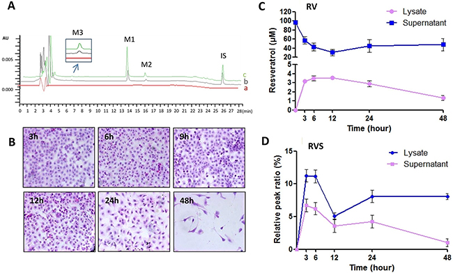 Figure 3: RV metabolic pattern in HBC T24 cells. A. Representative HPLC/DAD analysis of resveratrol in T24 cells. (a) HBC T24 cells treated without RV as Control; (b, c) T24 cells treated with 100μM resveratrol for 48h, cell supernatant (b) and cell lysates (c) spiked with 1,8-dihydroxy anthraquinone (internal standard, IS). Peaks: M1. trans-resveratrol, tR=13.82min; M2. cis-resveratrol, tR=15.97min; M3. resveratrol monosulfate (RVS), tR=6.67min; IS. 1,8-dihydroxy anthraquinone, tR=25.93min (Internal standard/IS). B. Morphologic changes were evaluated by HE staining (100×), and T24 cells showed neither observable growth arrest nor morphological change until 24h resveratrol incubation. C & D. Quantification of RV and RVS in T24 cells. Resveratrol concentrations in the cell lysates and supernatant after 100μM resveratrol treatment for 3, 6, 12, 24 and 48h, respectively.