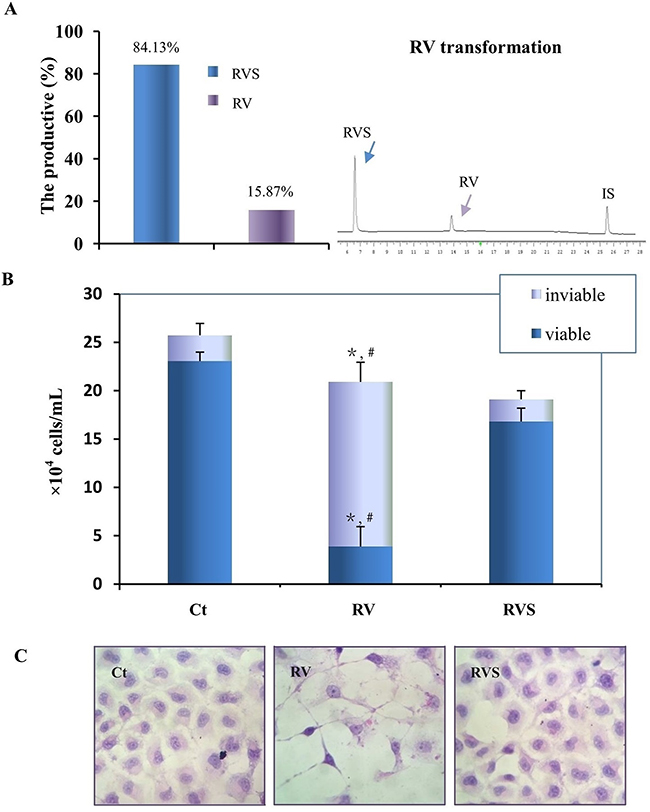 Figure 5: Biotransformation and bioactivity evaluation of RVS on T24 cells. A. Quantification of the biotransformation efficiency of RVS (Left) by representative HPLC analysis (Right). RV, RVS and IS represent resveratrol, resveratrol monosulfate and 1,8-dihydroxy anthraquinone (Internal standard), respectively. B. Cells number was determined by Trypan Blue exclusion after normal culture (Ct), 100μM trans-resveratrol (RV), and 84.13% resveratrol monosulfate/15.87% trans-resveratrol mixture (RVS) incubation for 48h, respectively. The column indicates the number of viable cells. *, #, RV treatment compared with Ct and RVS treatment, respectively (P<0.01). C. Morphologic evaluation of T24 cells incubated with normally culture (Ct), 100μM trans-resveratrol (RV), and resveratrol monosulfate/trans-resveratrol mixture (RVS) for 48h by HE staining (200×).