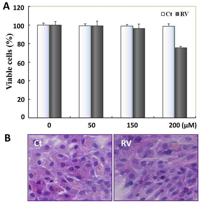 Figure 6: The safety evaluation of resveratrol to PBC cells. A. Resveratrol’s effect on the cell viability of the primary cultured normal rat bladder epithelial cells (PBC). Cells number was determined by MTT after 48h-100μM resveratrol incubation, data were expressed as means ± S.D. (n=3) (*, P<0.05). B. HE morphological staining performed on PBC cells with 100μM resveratrol treatment for 48h. PBC cells showed neither observable growth arrest nor morphological change. Ct, represented PBC cells were cultured in normal culture media; RV, represented PBC cells were treated with 100μM resveratrol treatment for 48h.