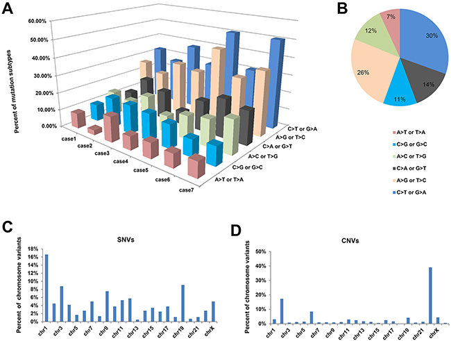 Figure 1: High frequency of C>T transversions identified in SNVs. A. Histogram of mutation frequencies across all seven paired samples. Base substitutions were divided into six categories to represent the six possible base changes (each category was represented by a different color). B. Inset pie charts indicate the average distribution of substitutions. C, D. show the percentage of single nucleotide variants (SNVs) and copy number variants (CNVs) occurred on each chromosome. Chr means chromosome.