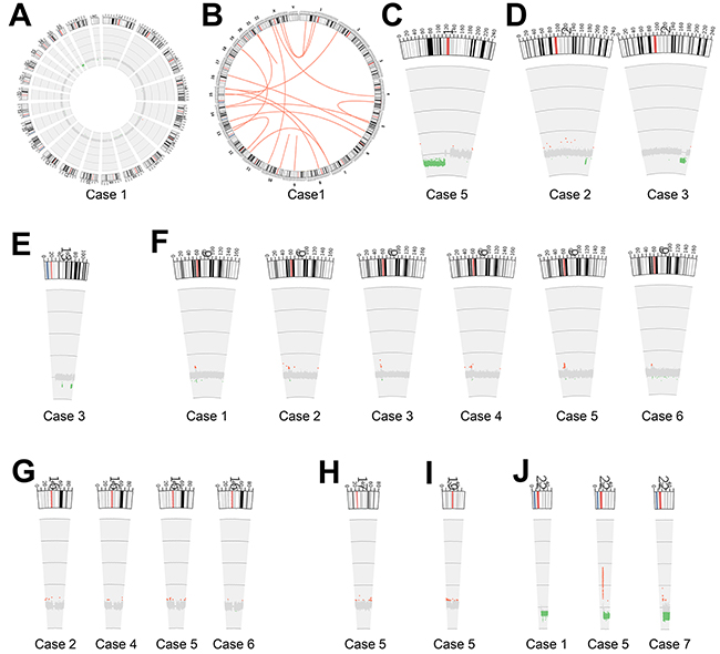 Figure 2: Patterns of chromosomal rearrangements and copy number alteration. A, B. Representative Circos images show (A) copy-number alternations and (B) intra- or inter- chromosomal rearrangements (case 5) across the whole genome. Red lines refer to translocations and inversions. C-J. show large fragment alterations and regional copy number variants on each chromosome across seven meningioma samples. Green color represents copy number deletion, and red represents copy number amplification.