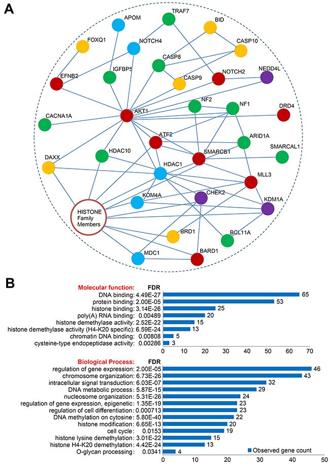 Figure 5: Network and Gene Ontology/pathway analysis of candidate genes. A. A total of 130 selected candidate genes were subjected to interaction network analysis using STRING website tools. All protein-protein interactions were manually drawn based on the analysis results of STRING. The remaining proteins without significant interaction with this main network were not shown. B. Gene Ontology/pathway analysis of the candidate genes. Only top enriched GO categories were shown. Gene list can be found in Supplementary Table 8. FDR, false discovery rate.