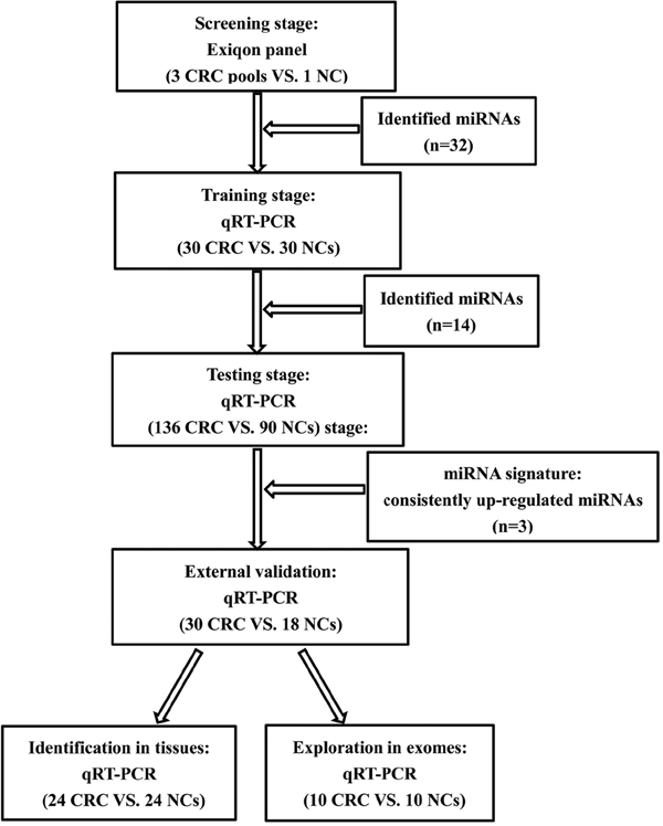 In the present study, we performed a four-phase study to screen miRNAs in CRC serum samples. In the screening phase, we systematically analyze the miRNA expression profile in 3 peripheral serum pools from 30 CRC cases and 1 pooled sample from 10 controls using miRCURY platform. Differentially expressed miRNAs were subjected to individual qRT–PCR confirmation in 30 CRC patients and 30 healthy controls in the training stage. Then, in the validation phase, the identified miRNAs were further detected in additional samples, including 136 CRC patients and 90 healthy subjects. Meanwhile, the diagnostic potential and effectiveness of these miRNAs for the detection of CRC was evaluated in an independent cohort of 30 CRC serum samples and 10 NCs. Furthermore, the expression profile of identified miRNAs was assessed in the CRC tissue. Serum exosomal miRNAs were further analyzed to explore the potential form of the identified miRNAs in serum of CRC patients.