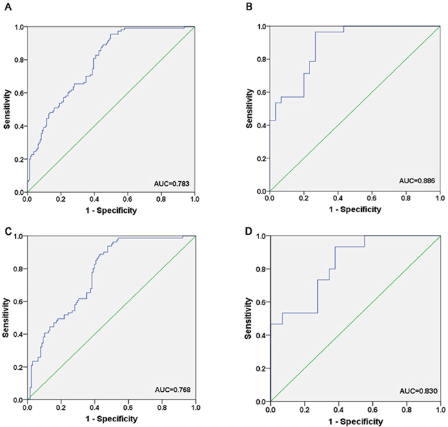 Figure 3: Receiver-operating characteristic (ROC) curves for the three-miRNA panel to discriminate CRC patients from NCs. A. the combined two phases of training and validation phases (166 CRC VS. 120 NCs); B. training phase (30 CRC VS. 30 NCs); C. validation phase (136 CRC VS. 90 NCs); D. external validation (30 CRC VS. 18 NCs). AUC: area under the curve.