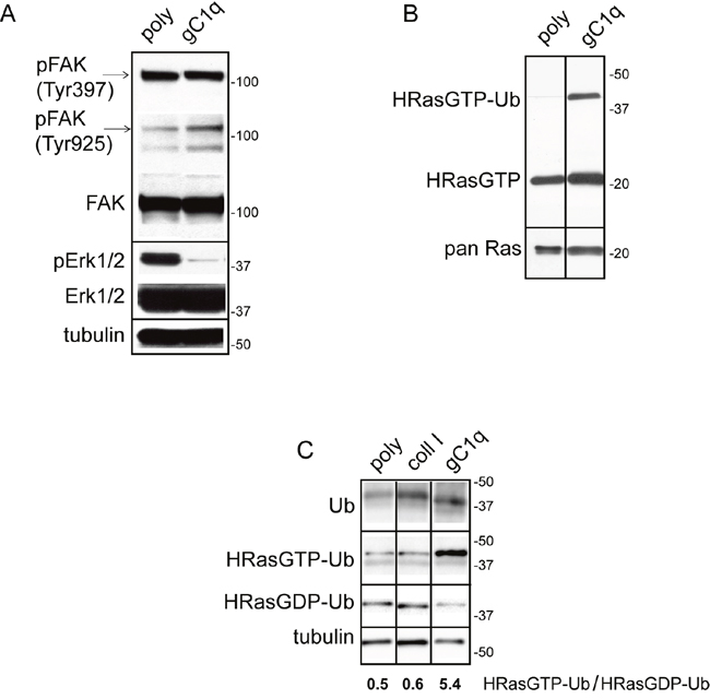 Figure 1: Persistent adhesion to gC1q downmodulates pERK1/2 and upregulates “HRasGTP-Ub”. A. HaCat cells were lysed 24 hours after plating on polylysine (poly) or gC1q coated plates. The blots were incubated with the indicated antibodies. Tubulin was used as loading control. B. Western blot analysis of proteins extracted from HaCat cells 24 hours after plating on polylysine (poly) or gC1q and incubated on a Raf-GST resin. Pan Ras was used to normalize loading. C. Western blot analysis of proteins extracted from HaCat cells 24 hours after plating on polylysine (poly), collagen type I or gC1q and incubated on a Raf-GST resin. Tubulin was used as loading control.