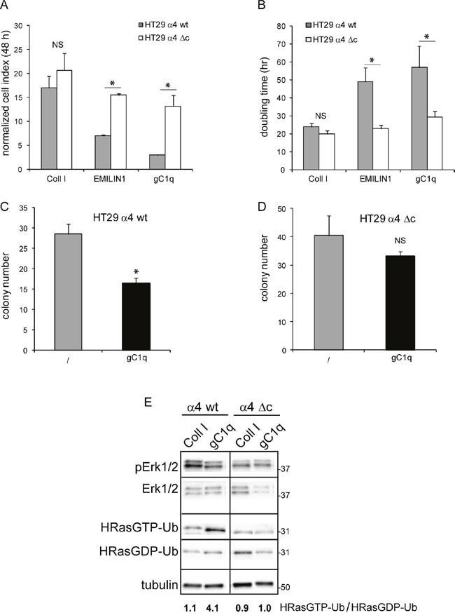 Figure 4: Cells growth is decreased by gC1q. Cellular growth of HT29 cells transfected with the wild type (wt) or the deleted (Δc) α4 integrin chain and plated on collagen type I (Coll I), EMILIN1, or gC1q expressed as either normalized cell index A. or doubling time B. and calculated as the mean ± SD from n = 3 experiments with n = 6 replicates. Cells were allowed to proliferate for 48 hours. Cell index curves were then normalized (normalized cell index) to the point corresponding to 1 hour after plating (maximum cellular adhesion) in order to express proliferation ability independently from attachment to a particular substrate. C. HT29 cells transfected with the wild type (wt) or D. the deleted (Δc) α4 integrin chain and plated in 0.4% agar in the presence or in the absence of gC1q. E. Modulation of HRas-Ub and pERK1/2 in α4 integrin chain transfected HT29 cells. HT29 cells were lysed 24 hours after plating on collagene type I (Coll I) or gC1q coated plates. The blots were incubated with the indicated antibodies (see under Material and Methods). Tubulin was used as loading control. Cell lysates were pulled down on a Raf-GST resin to isolate HRasGTP-Ub.