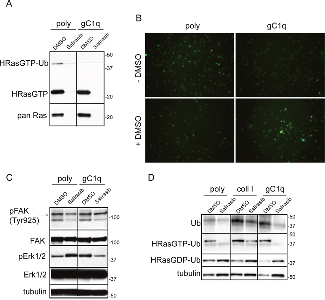 To prevent HRas pathway activation we interfered with the membrane anchoring of HRas after its farnesylation by treating cells with salirasib. Accordingly, after salirasib treatment both HRasGTP as well as the HRasGTP-Ub forms were detected neither in cell adherent to gC1q nor to polylysine (Figure 5A).