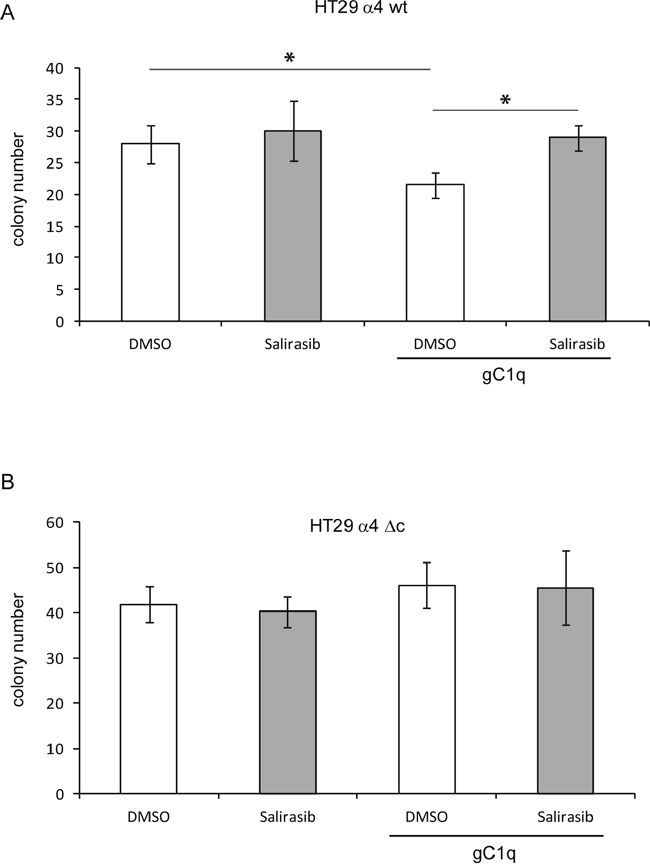 Figure 6: Cells growth in the presence of gC1q is rescued by salirasib. A. HT29 cells transfected with the wild type (wt) or B. the deleted (Δc) α4 integrin chain and plated in 0.4% agar in the presence or in the absence of gC1q and treated with salirasib or DMSO as control. *, P < 0.05.