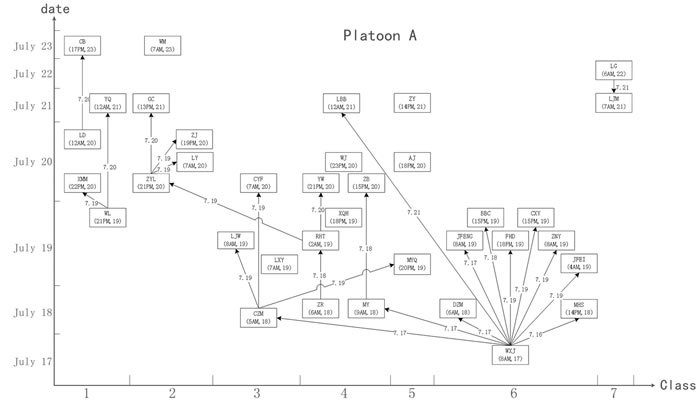 Figure 2: Schematic diagram demonstrate the possible propagation chain of platoon A. The patient’s name and date of onset (accurate to hours) are shown in the box. The possible route and date of propagation are represented as an arrow. The X axis represents the onset date. The Y axis represents the classes (dormitories) where the patients lived. WXJ was the key node among the 36 patients, and 7 of the 9 classes involved were in platoon A.