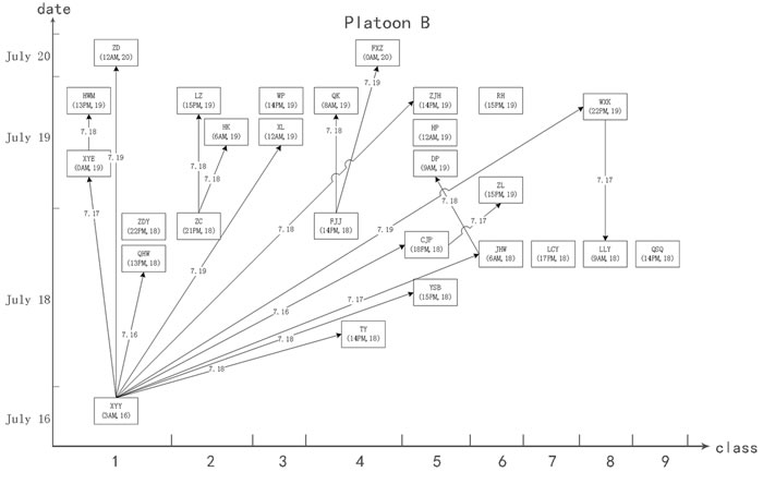 Figure 3: Schematic diagram demonstrate the possible propagation chain of platoon B. The patient’s name and date of onset (accurate to hours) are shown in the box. The possible route and date of propagation are represented as an arrow. The X axis represents the onset date. The Y axis represents the classes (dormitories) where the patients lived. XYY was the key node among the 27 patients, and all 9 classes in platoon B were involved.