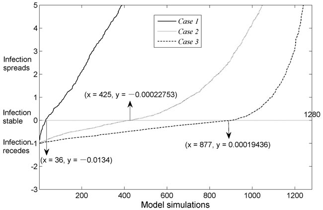 Figure 4: Uncertainty analysis shows infection dynamics for the three cases. Dynamic change of infection rate is plotted on the Y axis (positive Y indicates infection propagation, negative Y indicates subsidence) by the output variable of interest. The plot shows that the critical values for cases 1-3 are 36, 425 and 877, respectively. The X axis represents model runs (total of 1,280). The model outputs for each case are sorted in ascending order, so that each plot is a monotonic curve, and the Y axis is cut (scaled from -3 to +5) to visualize the plot around zero.