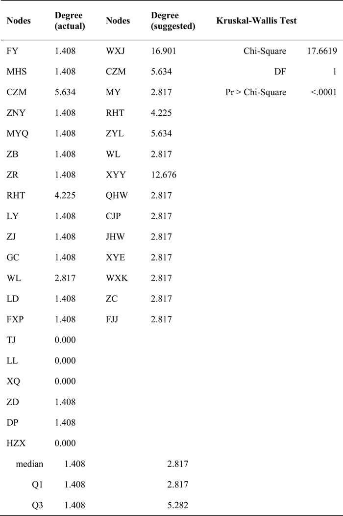 Normalized centrality measures (degree and betweenness) of all 72 index cases were analyzed using SNA (Table 1). A total of 14 nodes (six from platoon A; eight from platoon B), all with high values of degree and betweenness centrality, were suggested to be sampling objects (Tables 2 and 3). Kruskal-Wallis test results showed statistical significance in degree centrality (χ2 = 17.6619, P < 0.0001, Table 2) and betweenness centrality (χ2 = 21.4186, P < 0.0001, Table 3), showing the two selection methods (SNA approach and traditional method) of sampling objects to be significantly different.
