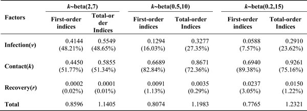 Factor k (contact coefficient) was distributed as three different ranges. When distributed as k ~ beta (2, 7), the first-order indices of factors v, k and r were 0.4144, 0.4450, and 0.0002, respectively, and the total-order indices were 0.5549, 0.5855, and 0.0001, respectively. Other indices are shown in Table 4.
