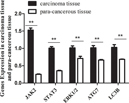 Figure 1: The mRNA levels of jak2, stat3, erk1/2, atg7, lc3b genes in carcinoma tissues are significantly lower than that in para-carcinoma tissues. Expression level of target genes quantified by qRT-PCR (normalized by gapdh. mean ± SE are shown; n = 3. **p < 0.01; *p < 0.05; ns, no significance).