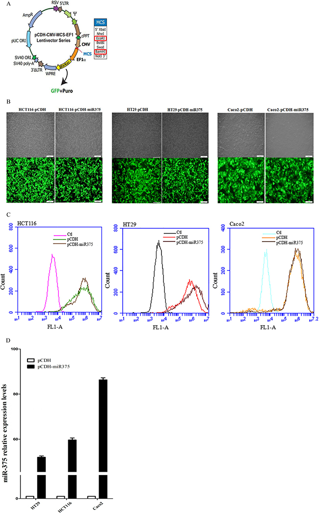 miR-375 virus particles were produced from pCDH-miR-375 construction (Figure 2A), and infected Caco2/HCT116/HT29 cells respectively. The infection efficiency was observed by inverted microscope (Figure 2B) and detected by flow cytometry (Figure 2C). The expression level of miR-375 was quantified by Real-Time PCR (Figure 2D). miR-375 stable expressing pCDH-miR375-Caco2/HCT116/HT29 cells and pCDH vector controls were selected by puromycin.