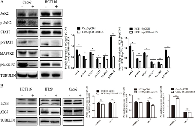 Figure 3: miR-375 down-regulated JAK2/STAT3 and MAPK/ERK signaling pathways, but miR-375 down-regulated ATG7 in a cell line specific way. (A) Effects of miR375 on the protein level of JAK2/STAT3 and MAPK/ERK signaling pathways in CRC cells measured by western blot. (B) Effects of miR-375 on the protein level of LC3B II/I and ATG7 measured by western blot (mean ± SE of relative protein level are shown; normalized by tubulin; n = 3. **p < 0.01; *p < 0.05; ns, no significance).