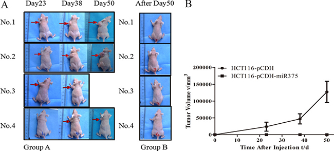 Figure 6: miR-375 suppressed the tumoregenesis in nude mice. (A) Nude mice injected with pCDH-HCT116 control (Group A) and pCDH-miR375-HCT116 (Group B) (B) Growth curve of tumor size. (mean ± SE are shown; n = 4. **p < 0.01; *p < 0.05; ns, no significance).