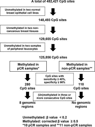Figure 1: Screening process of genomic regions whose methylation statuses were associated with pCR to trastuzumab and chemotherapy. From the 482,421 CpG sites on the Infinium HumanMethylation450 BeadChip array, those unmethylated in normal breast epithelial cell lines, non-cancerous breast tissues, and peripheral leucocytes were selected. A total of 280 CpG sites were preferentially methylated in responders, and 110 CpG sites were in non-responders. By selecting genomic regions with three or more consecutive differentially methylated CpG sites, eight genomic regions were found to be preferentially methylated in pCR samples. A methylated CpG site was defined when its corrected β value was ≥ 0.5. An unmethylated CpG site was defined when its β value was < 0.2.