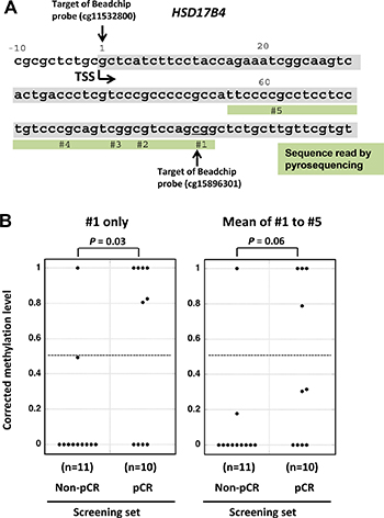 As a marker to predict pCR to trastuzumab and chemotherapy against HER2-positive breast cancer, HSD17B4 methylation was successfully identified by genome-wide methylation analysis, and was validated by analysis of an independent validation set of samples (P < 0.001). This was achieved by securing the samples for validation in advance, and enabled us to exclude the concern of over-fitting. The sensitivity and specificity in the validation set were 83% and 79%, respectively, after applying the cutoff value established in the screening set. Multivariate analysis showed that HSD17B4 methylation was an independent predictive factor for pCR. These results therefore show that a patient with HSD17B4 methylation is highly probable to achieve pCR with trastuzumab and chemotherapy of a primary HER2-positive breast cancer.