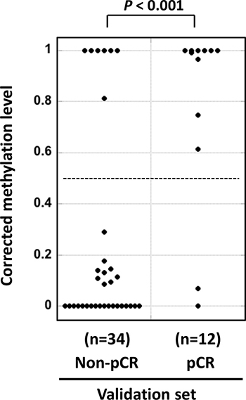 The measured methylation level was corrected according to the fraction of cancer cells in a sample [corrected methylation level = 100 × (measured methylation level) / (fraction of cancer cells in the sample {%})]. The fraction of cancer cells (%) was obtained by microscopic observation.