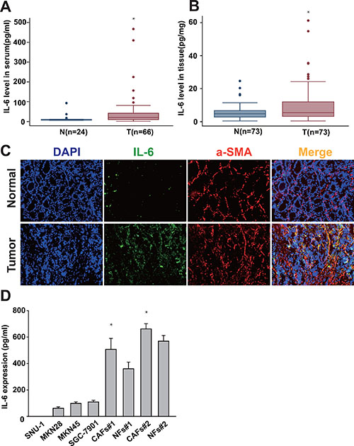 Figure 1: IL-6 is highly expressed in gastric CAFs. (A, B) The expression of IL-6 in both serum and cancer tissues in gastric cancer patient was detected by ELISA. (C) Frozen tissue sections from gastric cancer and adjacent non-tumor tissue were immunostained by DAPI (nucleus), FITC (IL-6) and PE (α-SMA) (200×). (D) IL-6 protein expression level in the gastric cancer cells (SNU-1, MKN45, SGC7901 and MKN28), gastric CAFs and normal fibroblasts (NFs) was quantified 24hrs after change the culture medium by ELISA. *P < 0.05.