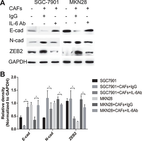Figure 3: CAFs promote EMT of gastric cancer cells via the secretion of IL-6. (A) Protein expression of E-cadherin, N-cadherin and ZEB2 in gastric cancer cells SGC-7901 and MKN28 co-cultured with CAFs in the presence of IL-6 neutralizing antibody or IgG isotype control antibody was analyzed by western blot. Representative images from one of the three independent experiments are presented. (B) Densitometric analysis of E-cadherin, N-cadherin and ZEB2 expression is shown.
