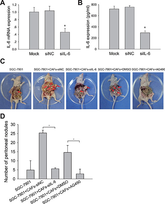 Figure 5: Blocking IL-6-JAK2-STAT3 pathway impairs tumor peritoneal dissemination and metastasis induced by CAFs in vivo. (A) IL-6 mRNA levels in CAFs treated with siRNA or siNC were detected by qRT-PCR. (B) IL-6 protein concentration in the medium conditioned by CAFs treated with (siIL-6) or control siRNA (siNC) were measured by ELISA. (C) SGC-7901 cells and SGC-7901 cells mixed with CAFs that were transfected with IL-6 siRNA (siIL-6) or control siRNA (siNC) were inoculated into nude mice. Mice co-injected with SGC-7901 cells and CAFs were administered i. p with AG490 (500 μg/100 ul/mouse) or equivalent concentration of DMSO once a week. The peritoneal nodules (red arrows) were observed after 30 days (N = 5 per group). (D) Average peritoneal nodules from nude mice are shown. Data are representative of three independent experiments. *P < 0.05.