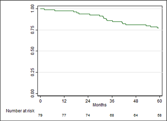 Patients were matched by subtype and age. Median follow-up was 90 months (range 26–157). The recurrence free survival (RFS) curve showed that 77% (95% CI: 66%–85%) of patients was disease free at 5 years of surgery (Figure 1).