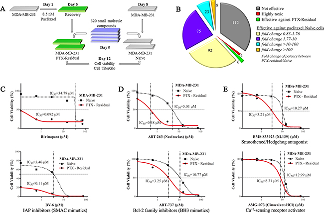Figure 1: A High Throughput Screen (HTS) to identify effective compounds against paclitaxel-residual MDA-MB-231 cells. (A) Cartoon of the HTS workflow. Day 0: seeding of 4 × 103 MDA-MB-231 cells in 384-well white opaque TC plates in 40 μl of growth medium. Day 1: addition of paclitaxel at 5× concentration (final concentration, 8.5 nM) by the GNF instrument, followed by incubation for 96 h. Day 5: recovery in drug-free medium for 96 h utilizing robotic station (Biotek dispenser/Liconic incubator/BRAVO robot). Day 8: seeding of 1.5 × 103 paclitaxel-naïve cells. Day 9: addition of the library of small molecule compounds by Echo transfer for 72 h in 5 serial dilutions (120 nM-75 μM and 16 nM-10 μM where appropriate) in triplicates. Day 12: Assessment of cell viability by CellTiter Glo luminescent cell viability assay, followed by automatic reading of the luminescent signal (Liconic incubator/BRAVO robot/PheraStar reader). (B) Graphical summary of the results of the HTS. Out of the 208 small molecule inhibitors that were effective against MDA-MB-231 cells, only 6 were selectively potent against paclitaxel-residual cells (green). Among the compounds that were more effective against paclitaxel-naïve cells (N = 198), treatment with paclitaxel caused variable increase of the IC50 as indicated. Notably, for 23 compounds the fold-increase of IC50 was 10–100, whereas for 8 compounds the IC50 was increased above 100-fold. (C–E) Effective small molecule inhibitors against paclitaxel-residual MDA-MB-231 cells. The small molecule inhibitors belong to two main categories, namely SMAC mimetics (C) and BCL-2 family inhibitors (BCL-XL, BCL-2, BCL-w) (D). Decrease in the viability of the paclitaxel-residual compared to parental paclitaxel-naïve cells was also observed following treatment with the SMO/HH pathway antagonist BMS-833923 (XL139) and the CaSR activator AMG-073 HCl (Cinacalcet hydrochloride) (E). PTX: Paclitaxel.