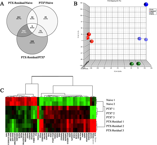 Figure 3: Affymetrix microarray expression profiling of parental naive, paclitaxel-residual and –resistant (PTXR) MDA-MB-231 cells. (A) Venn diagram of common and differentially expressed genes (p < 0.05, fold change > 2 and < -2) between the three groups: PTX-residual/naïve, PTXR/naïve and PTX-residual/PTXR cells. (B) Principal component analysis illustrating the variance between the different gene expression profiles of the biological replicates of naïve, PTX-residual and PTXR cells. PTX-residual cells display a markedly different expression profile compared to the other two groups. (C) Hierarchical clustering of the 43 commonly affected genes (Venn diagram, panel A) between either paclitaxel-residual or –resistant cells versus the parental naïve controls (Java TreeView [48]).