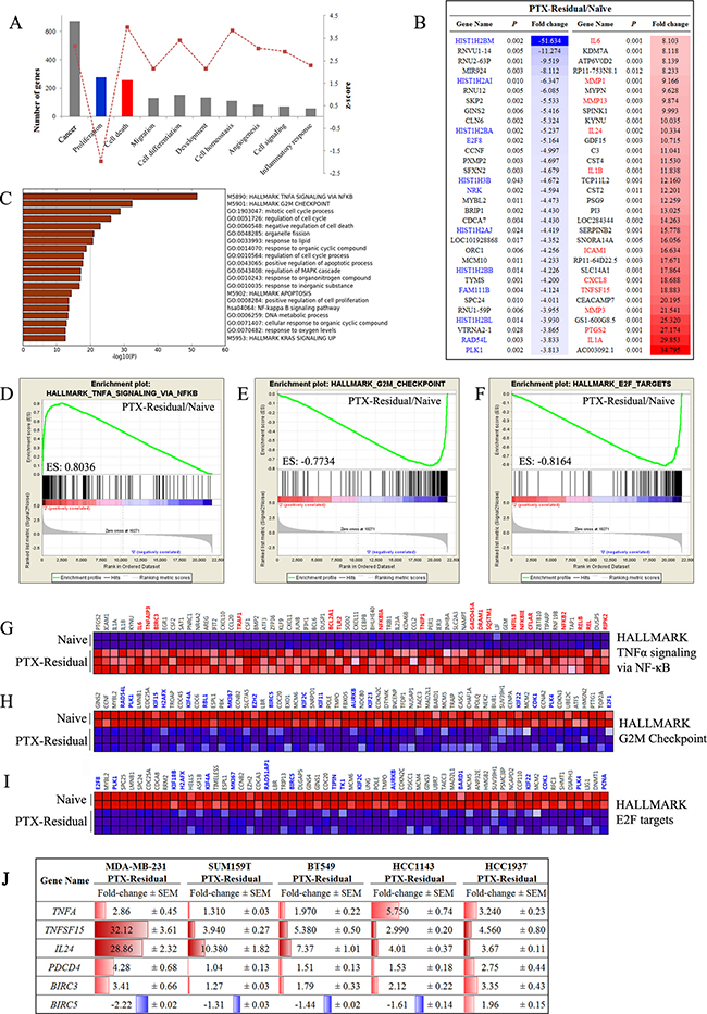 Figure 4: Gene expression analysis of paclitaxel-residual MDA-MB-231 cells. (A) Most significantly affected biological processes according to Ingenuity Pathway Analysis in PTX-residual MDA-MB-231 compared to the parental naïve cells. (B) List of top 30 significantly down- and up-regulated genes in the paclitaxel-residual group (Partek Genomics Suite). The fold change values are given as linear ratios of the respective gene expression values. Significantly downregulated or upregulated genes implicated in cell cycle-related processes or cell-death/stress response are highlighted in blue or red, respectively. (C) Pathway enrichment analysis (Metascape server) of the IPA apoptosis-related genelist. The most enriched pathway is the Hallmark TNFα signaling via NFκB, whereas the cell cycle-related pathways are negatively enriched. (D–F) Enrichment plots (GSEA) of the Hallmark genesets related with TNFα/NFκB signaling (D), G2M mitotic checkpoint (E) and E2F targets (F). (G) Heatmap of the significantly enriched genes of the HALLMARK TNFa signaling via NFkB geneset (GSEA). Genes that are implicated in the response to SMAC or BH3 mimetics are highlighted with red. Heatmaps of the negatively enriched (H) Hallmark G2M Checkpoint geneset and (I) Hallmark E2F targets (GSEA). Important genes (e.g. BIRC5, E2F1, AURKB, PLK1, various kinesins) are highlighted with blue. (J) qRT-PCR analysis of the indicated genes in the indicated paclitaxel-residual TNBC cell lines and their corresponding parental cells was used to calculate the relative gene expression levels. The results are presented as fold change of expression in paclitaxel-residual cells compare to parental cells. The mean values ± SEM from three independent experiments are shown. Increase in gene expression is highlighted in red and decrease in blue.