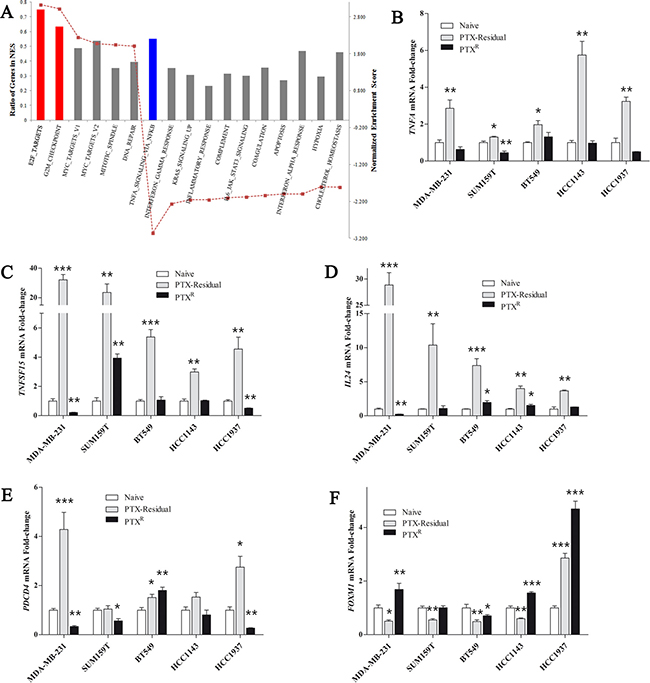 Figure 5: Transcriptional profile of paclitaxel-resistant cells compared to paclitaxel-residual cells. (A) Geneset enrichment analysis (GSEA) for the paclitaxel-resistant (PTXR) dataset compared to the residual counterparts. The results show an inverse enrichment of the significantly affected genesets with negative enrichment of TNFα/NF-κB signaling (blue), and upregulation of cell cycle-related genes (red). (B–F) Relative expression of the indicated genes in PTX-residual and PTXR TNBC cell lines. qRT-PCR analysis of the indicated genes in parental naïve, PTX-residual and PTXR TNBC cells was used to calculate the fold changes between gene expression levels in PTX-residual or PTXR cells and the respective naïve cells. The mean values ± SEM from three independent experiments are shown. The asterisks denote statistical significance *P < 0.05, **P < 0.01, ***P < 0.001. Statistical assessment was based on two-sided t test.