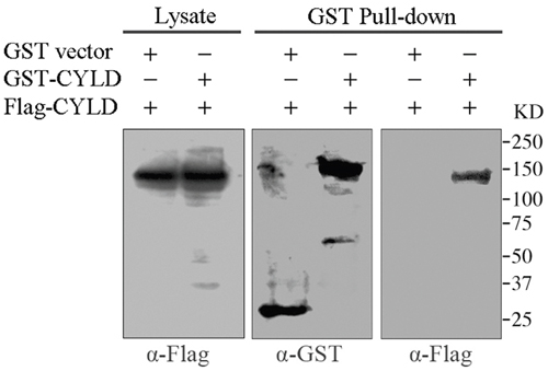 Figure 1: GST pull-down assays to analyze CYLD intermolecular interaction. HEK293T cells were co-transfected with GST vector or GST-tagged CYLD plasmid together with Flag-tagged CYLD plasmid. GST or GST-tagged CYLD were pull-downed and the precipitations were determined with anti-GST and anti-Flag antibodies, and cell lysates were analyzed as a control.
