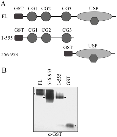Both the CAP-GLY domain and USP domain have been shown to mediate protein-protein interactions. To define the molecular mechanism of which domain is responsible for CYLD intermolecular interaction, we constructed GST-tagged CYLD truncations (Figure 2A) and then carried out native PAGE electrophoresis to analyze the formed complexes. Interestingly, full-length CYLD or the C-terminal truncation (556-953 version) that contains the USP domain was detected to migrate to different positions in the native gel that could suggest formation of complexes. However, CYLD N-terminal truncation (1-555 version) or GST itself did not show multi-band migration, and was likely present as monomers in the cell (Figure 2B). These observations suggest that the USP domain might mediate the CYLD intermolecular interaction. To confirm this hypothesis, we constructed GFP-tagged CYLD truncations (Figure 3A) and co-transfected cells with GST-tagged CYLD together with GFP-tagged CYLD-N-terminal truncation (1-555 version) or GFP-tagged CYLD-C-terminal truncation (556-953 version), and examined the pull-downed precipitations with anti-GFP antibodies. As shown in Figure 3B, GFP-tagged CYLD-C-terminal truncation, but not the N-terminal truncation, was detected in the precipitation, confirming that the USP domain is required for CYLD intermolecular interaction.