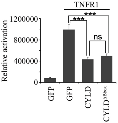 Figure 6: The B-box module is dispensable for the NF-κB suppressing activity of CYLD. HEK293T cells were transfected with pGL4.32-NF-κB-Luc and pcDNA3-LacZ plasmids together with or without pcDNA3-Flag-TNFR1 plasmid in the presence of pEGFPC1-CYLD or pEGFPC1-GFP-CYLDΔB-box plasmids. Luciferase and β-galactosidase activities were examined. *** indicates P<0.001; ns, not significant. Error bars indicate SEM.