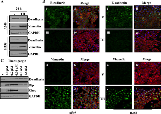 We previously showed loss of AAA+ ATPase VCP is sufficient to cause endoplasmic reticulum (ER) stress, which ultimately induces EMT in lung adenocarcinoma cells [13]. Thus we wanted to determine if direct disruption of ER homeostasis via chemical disruption of ER function, could also induce EMT. To do this, we treated A549 and H358 cells with thapsigargin (TH), which is non-competitive inhibitor of the sarco/endoplasmic reticulum Ca2+ ATPase and is a well-known and well-studied ER stressor. Western blot analysis revealed significantly decreased expression of the epithelial marker E-cadherin and increased expression of the mesenchymal marker Vimentin following treatment with thapsigargin, indicating ER stress induced EMT in lung adenocarcinoma cell lines (Figure 1A). Thapsigargin-induced EMT in A549 and H358 cells was further confirmed by immunofluorescence staining for the EMT markers E-cadherin and Vimentin (Figure 1B). Again, E-cadherin staining was decreased and Vimentin staining increased following thapsigargin treatment of A549 and H358 (Figure 1B). Treatment with thapsigargin increased the expression of the ER stress markers Bip and CHOP at concentrations as low as 40 nM. Importantly, E-cadherin loss only occurred at concentrations of thapsigargin that induced ER stress as measured by activated Bip and Chop (Figure 1C). These data suggest that there is a close and parallel association between ER stress and EMT (Figure 1C) and demonstrate that ER stress can induce cells to adopt an EMT-like phenotype.