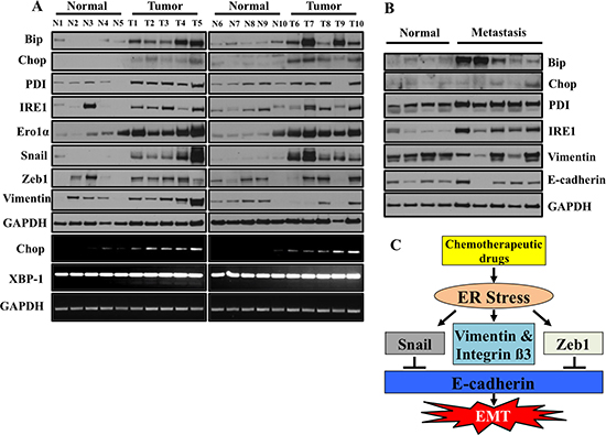 Figure 9: ER stress and EMT markers are co-expressed in primary lung tumors samples from patients. (A) Western blot analysis of ER stress response markers and EMT markers. Snap frozen tumors from patient biopsies and normal adjacent tissues were lysed and western blotted for ER stress response markers and EMT markers. Samples represent matched tumor/normal pairs, such that N1 is the normal and T1 is the corresponding tumor from the same patient. (B) ER stress and EMT markers are overexpressed in primary lung metastasis compared to normal tissues. Frozen tumors from patients and normal lung tissues were lysed and western blotted for ER stress response markers and EMT markers. Samples do not represent paired tumor/normal samples. The normal samples are random specimens from our biorepository not analyzed in (A). (C) Schematic presentation of regulation of EMT by ER stress.