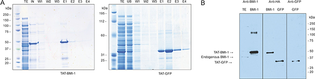 Figure 2: Affinity purification of TAT-BMI-1 and TAT-GFP recombinant proteins. (A) Coomassie staining of NUPAGE 4–12% gels of total induced bacterial extract (TE), input (IN), unbound (UB) wash (W) and Imidazole elution (E). (B) Western Blotting of purified TAT-proteins, identified by specific antibodies against the HA epitope or for BMI-1 and GFP. A total extract from K562 shows the presence of native BMI-1 at 36.9 KDa compared to the TAT-BMI-1 at 45 KDa.